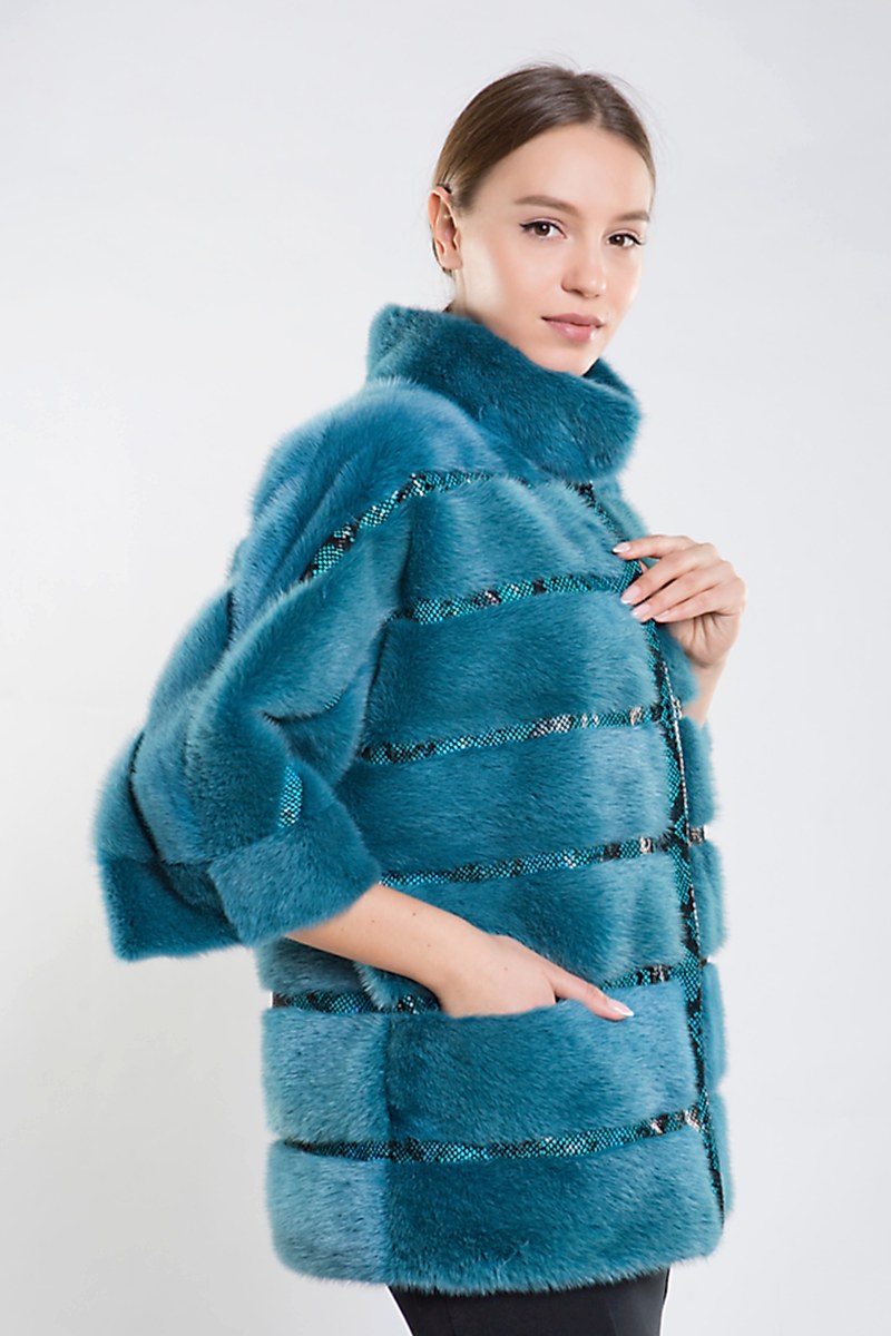 Куртка из меха норки. Модель декорирована натуральной кожей. Pin-Up стойка. Пройма рукава занижена. Курточка застегивается на оригинальные кнопки. Рукав модели укороченный. В такой курточке бирюзового цвета Вы будете неотразимы!