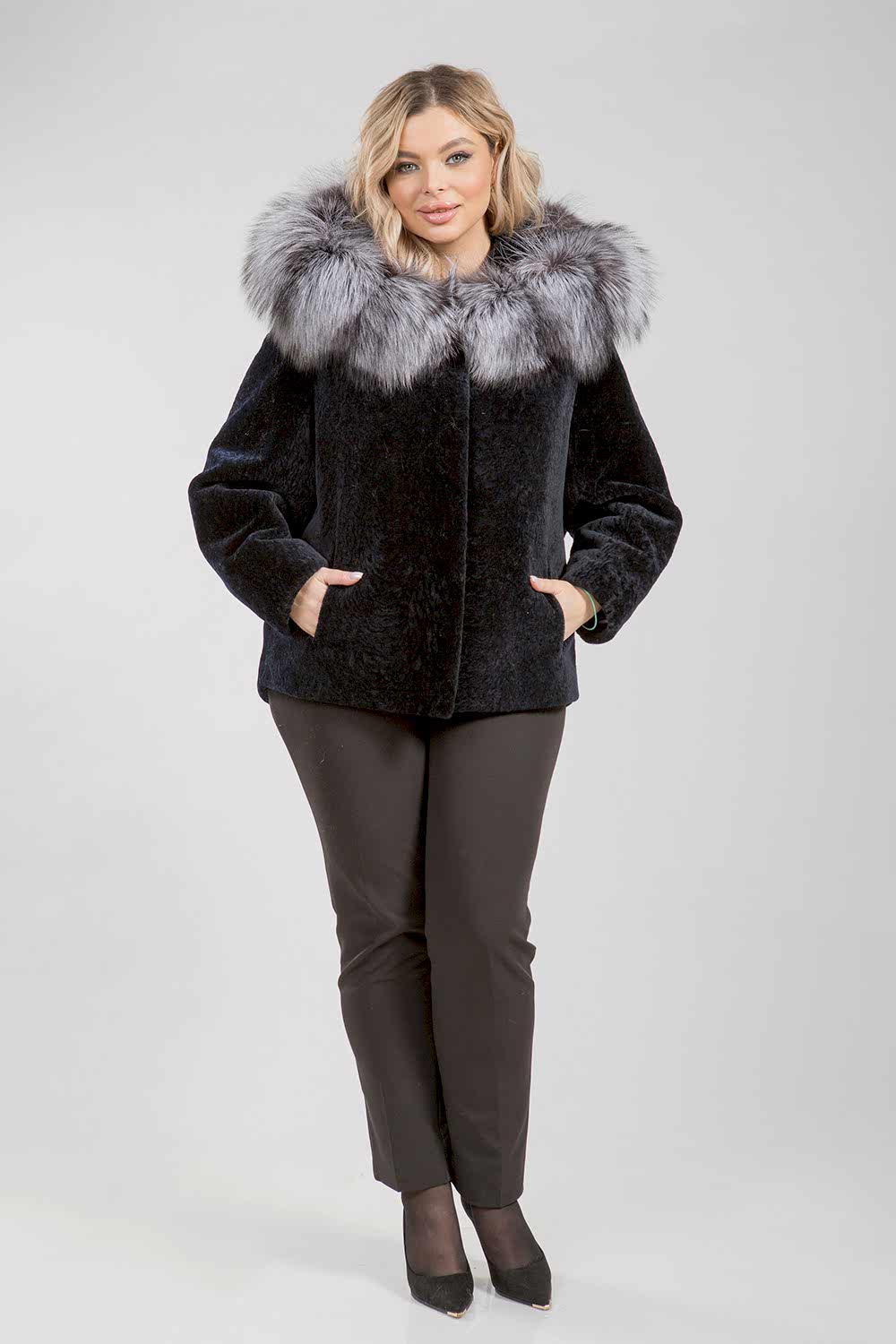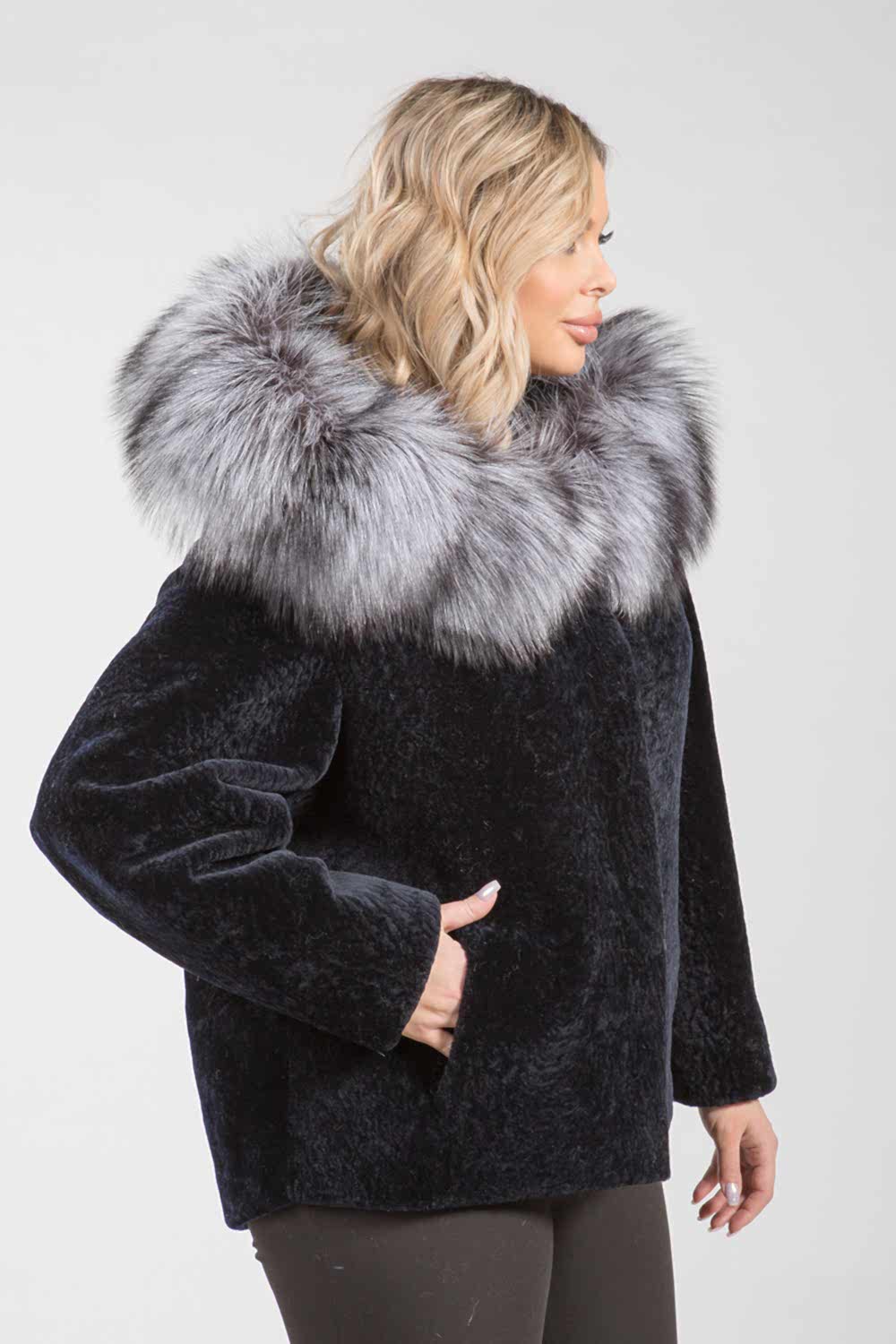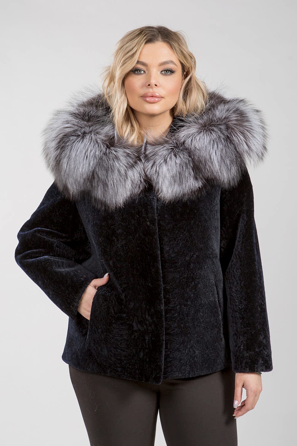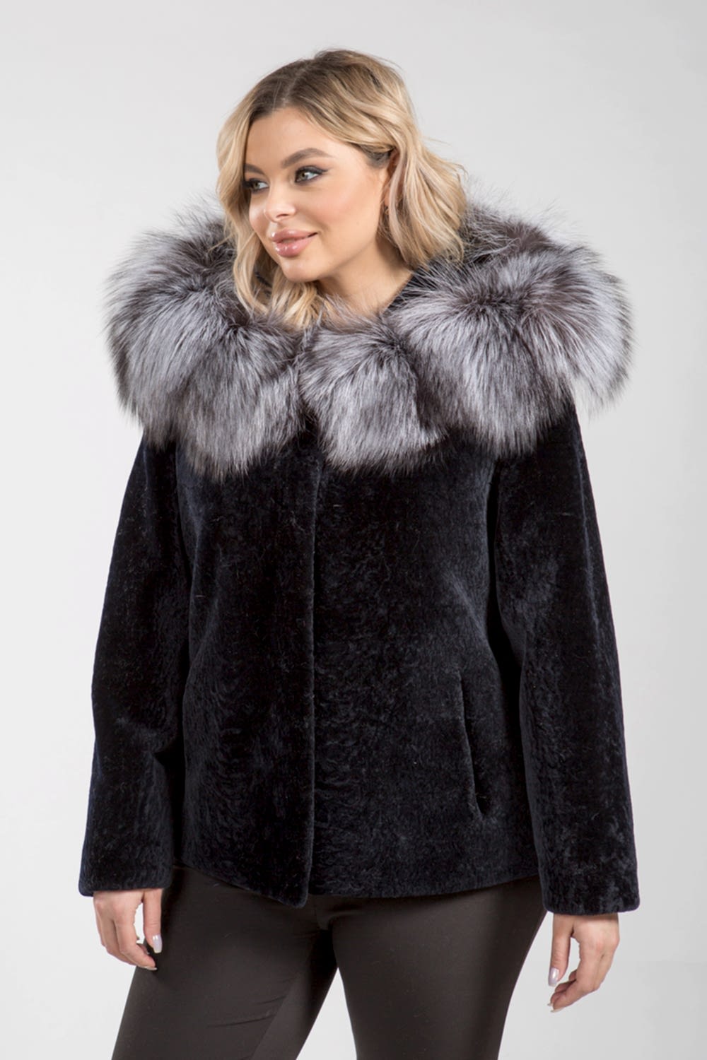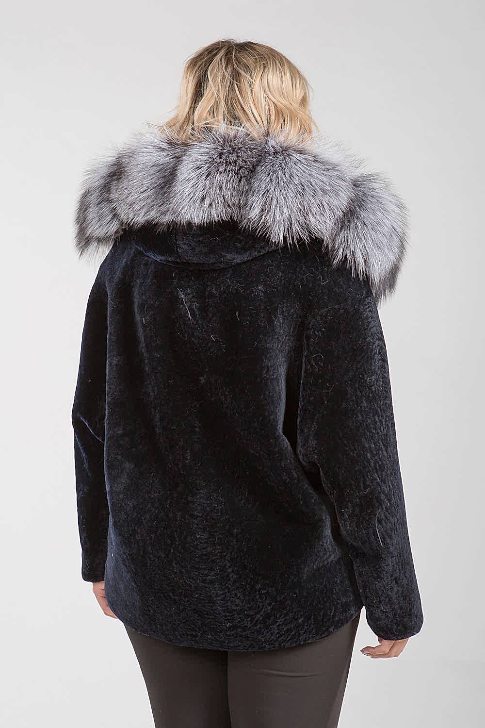Курточка из меха овчины (астрагана). Капюшон модели декорирован мехом шикарной лисы. Крой изделия пластины. Фасон рукава свободный. Pin-Up модели 75 см. Изделие застегивается на клипсы. Курточка легкая и теплая. Благородный черный цвет астрагана и великолепие меха лисы представляют неограниченные возможности для любительниц экспериментов, изменений стиля и имиджа!