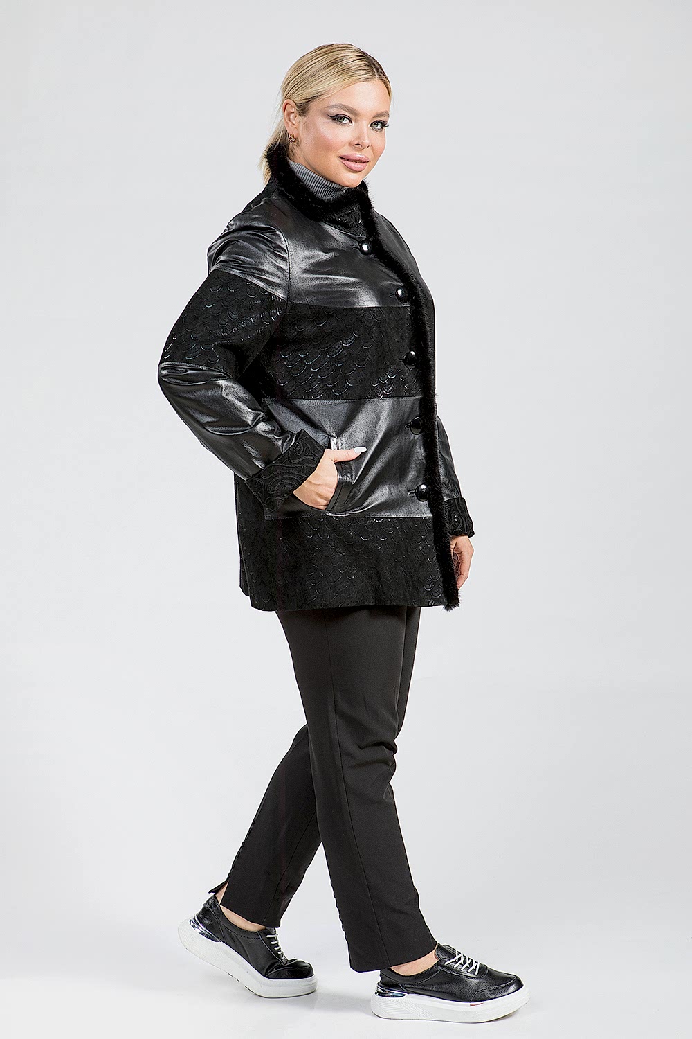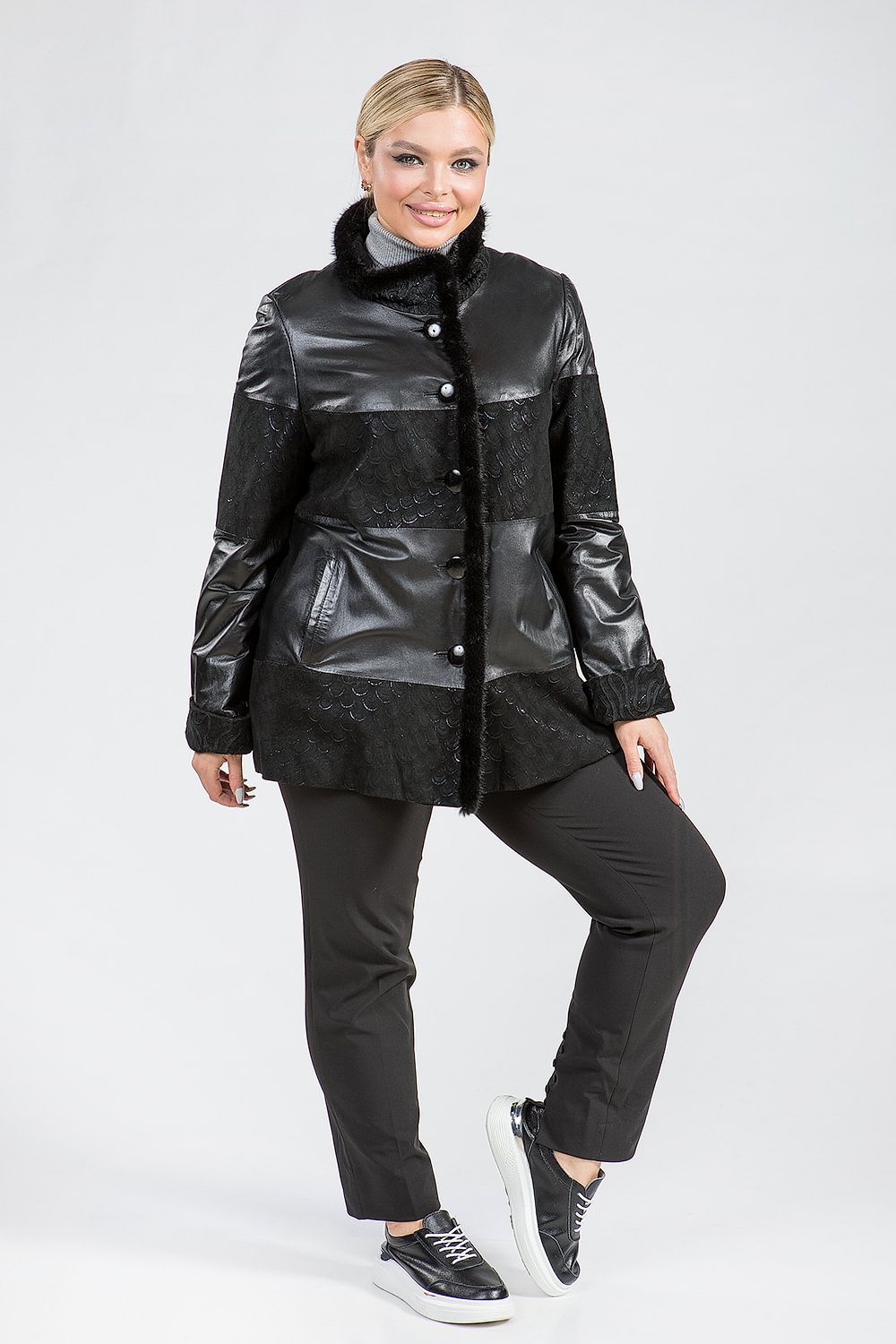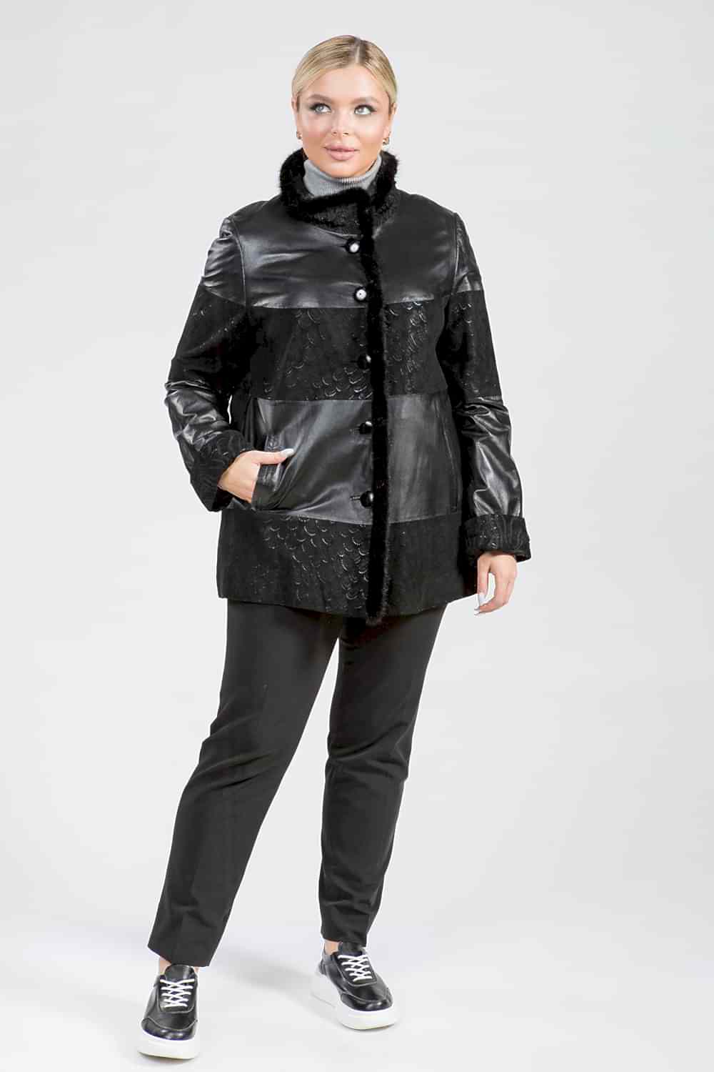 Куртка женская из натуральной кожи. Модель декорирована мехом норки. Рукава модели Pin-Up которые при желании можно подвернуть манжетами. Изделие застегивается на пуговицы и имеет по бокам карманы. Длина модели 75 см. Внутри куртки есть легкий, тонкий утеплитель, благодаря ему можно носить модель весной и осенью. Курточка очень хорошо сочетается с юбками, брючками и подойдет девушкам любой комплекции.