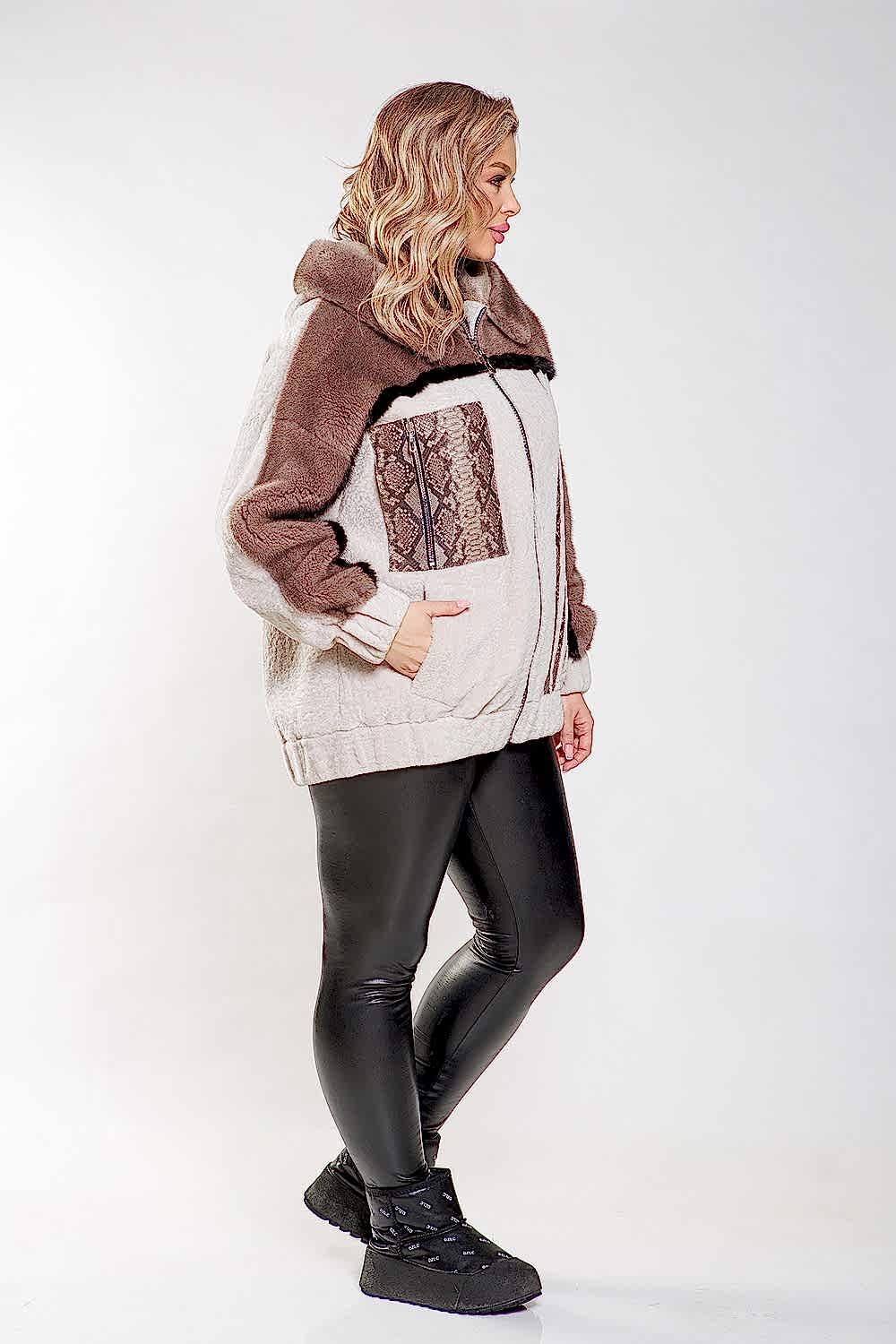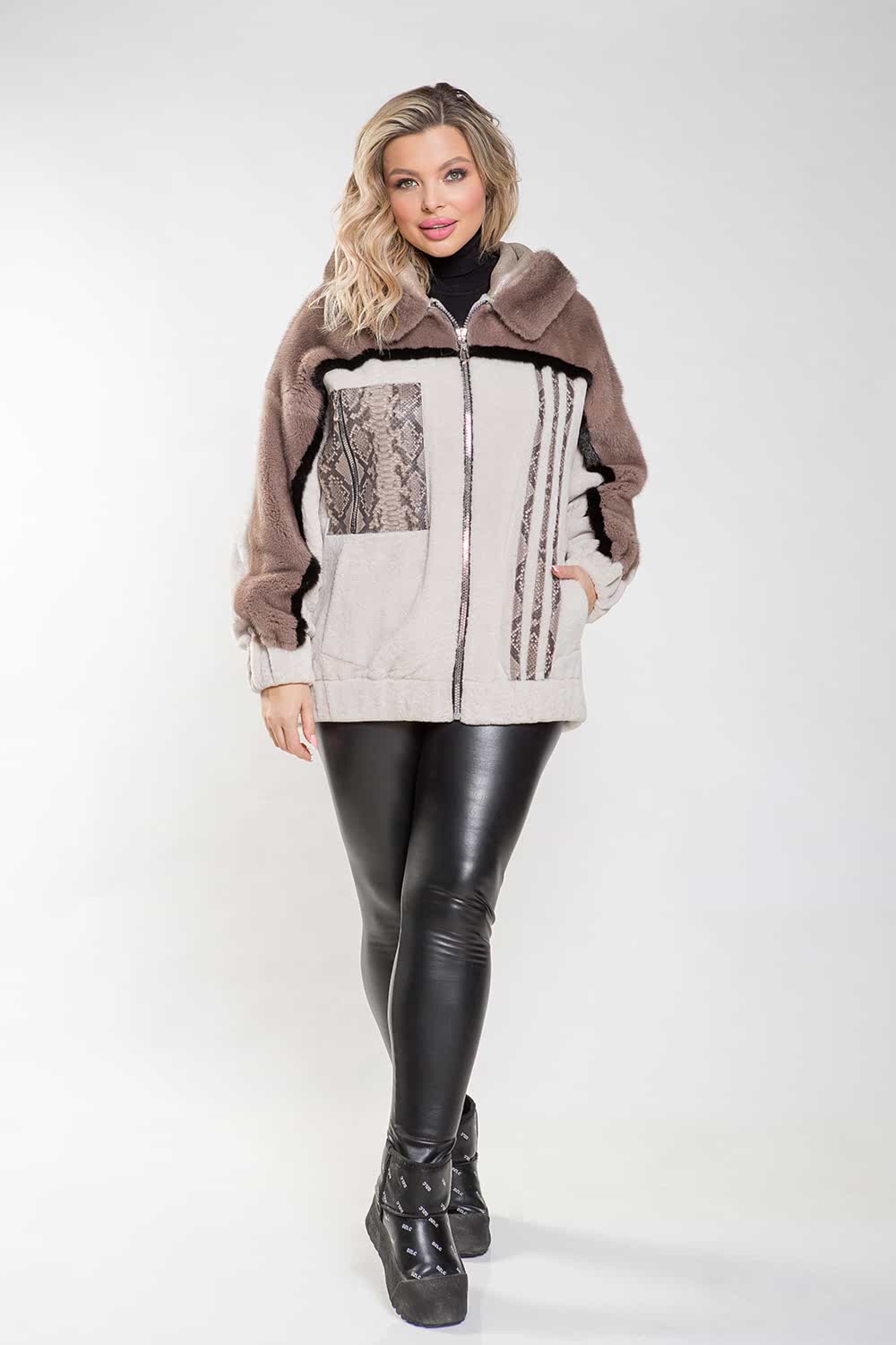 Женская натуральная куртка-дублёнка из овчины с капюшоном - это превосходный выбор для холодных дней. Модель украшена мехом норки, что придаёт ей особый шарм. Куртка застёгивается на Pin-Up а её два основных кармана дополняют один декоративный карман из кожи питона на груди. Длина изделия составляет 78 см, что делает его незаменимым элементом повседневного образа.