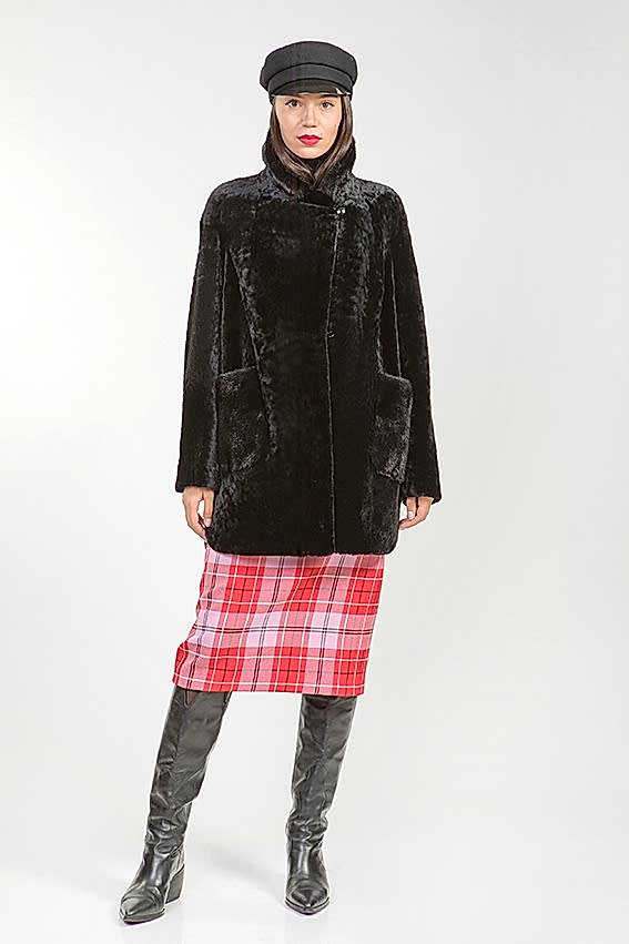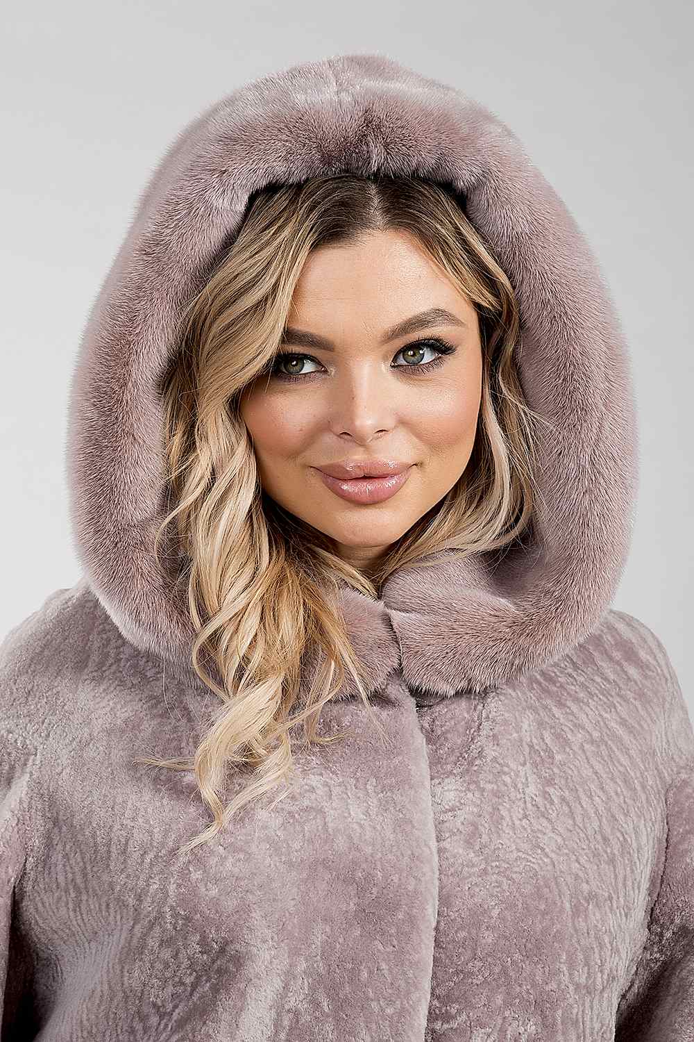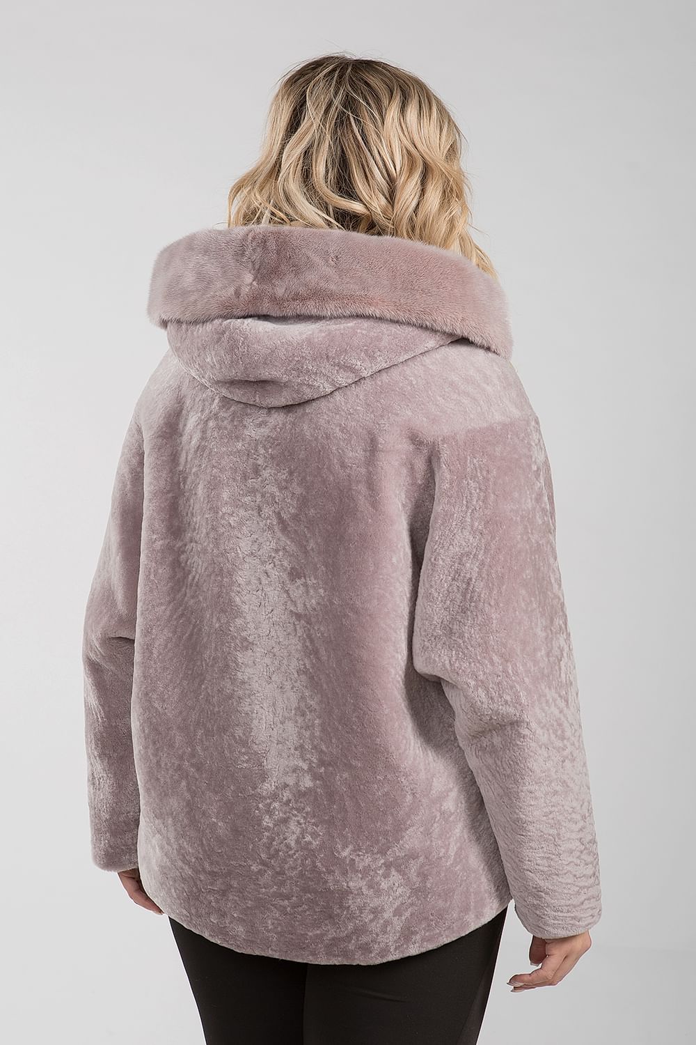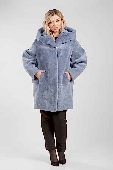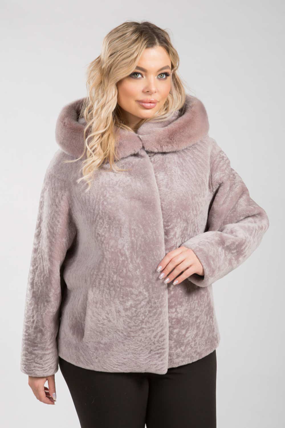Курточка из меха овчины (астрагана). Капюшон модели декорирован мехом норки. Крой изделия пластины. Фасон рукава свободный. Длина модели 75 см. Изделие застегивается на клипсы. Курточка легкая и теплая. Светлое изделие из натурального астрагана освежает и омолаживает Pin-Up