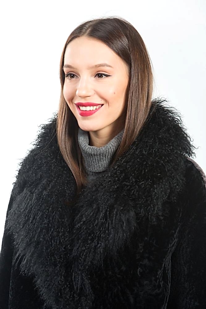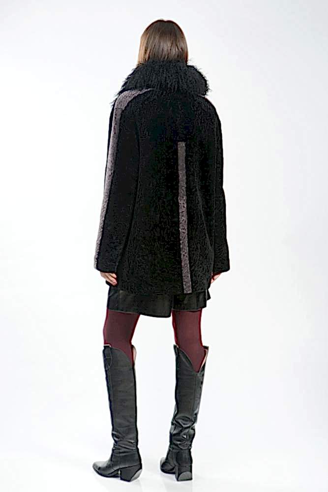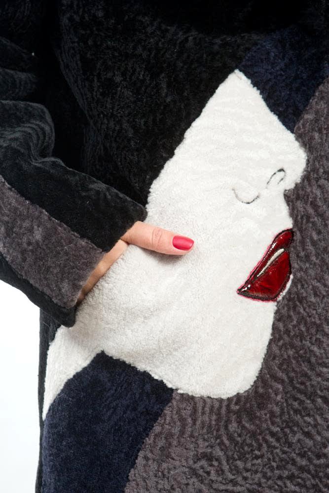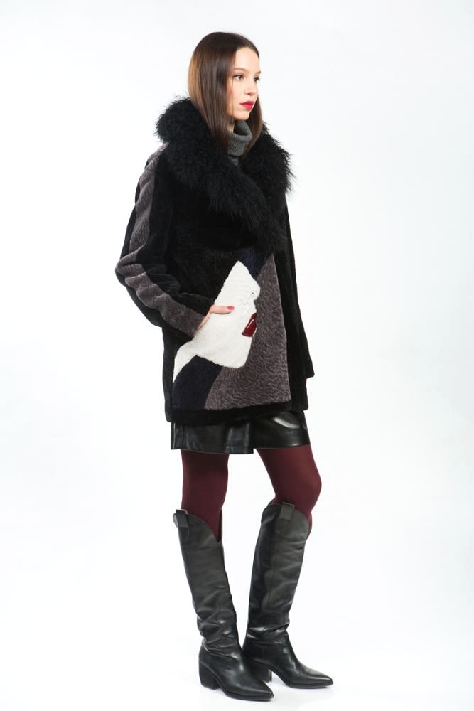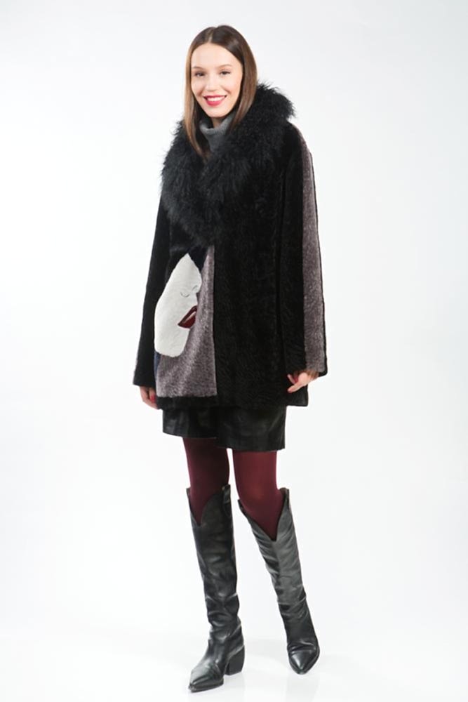 Куртка- полупальто из меха овчины (астраган). Воротник изделия дополнен мехом ламы. Модель декорирована меховым принтом и застегивается на Pin-Up Курточка выглядит эффектно, благодаря пушистой ламе, которая добавляет нотки шика и гламура!
