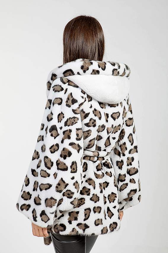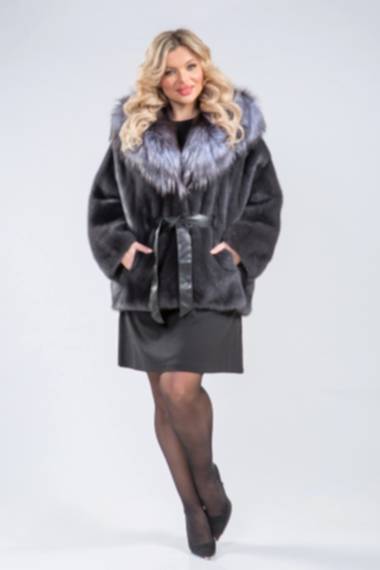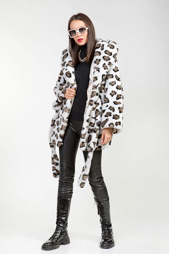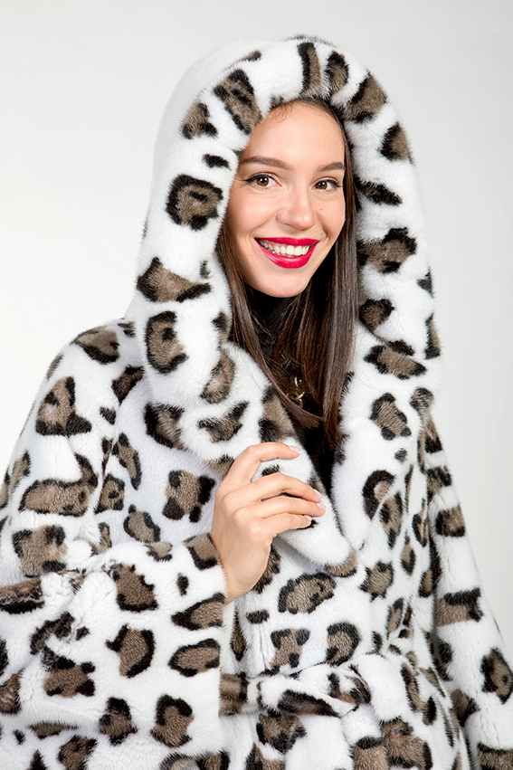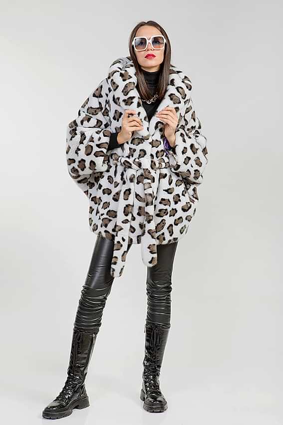 Куртка-пончо с Pin-Up из меха норки. Модель выполнена в пластинчатом крое с добавлением роспуска. Длина изделия составляет 80 см. Рукава имеют свободный крой. Удобный капюшон с утяжками обеспечивает защиту от холода. Расцветка напоминает снежного барса и вызывает положительные эмоции. Эта модель придаёт образу величественность и престижность.