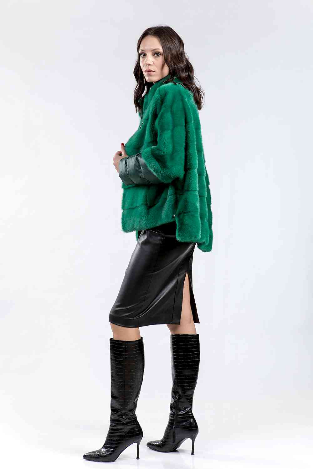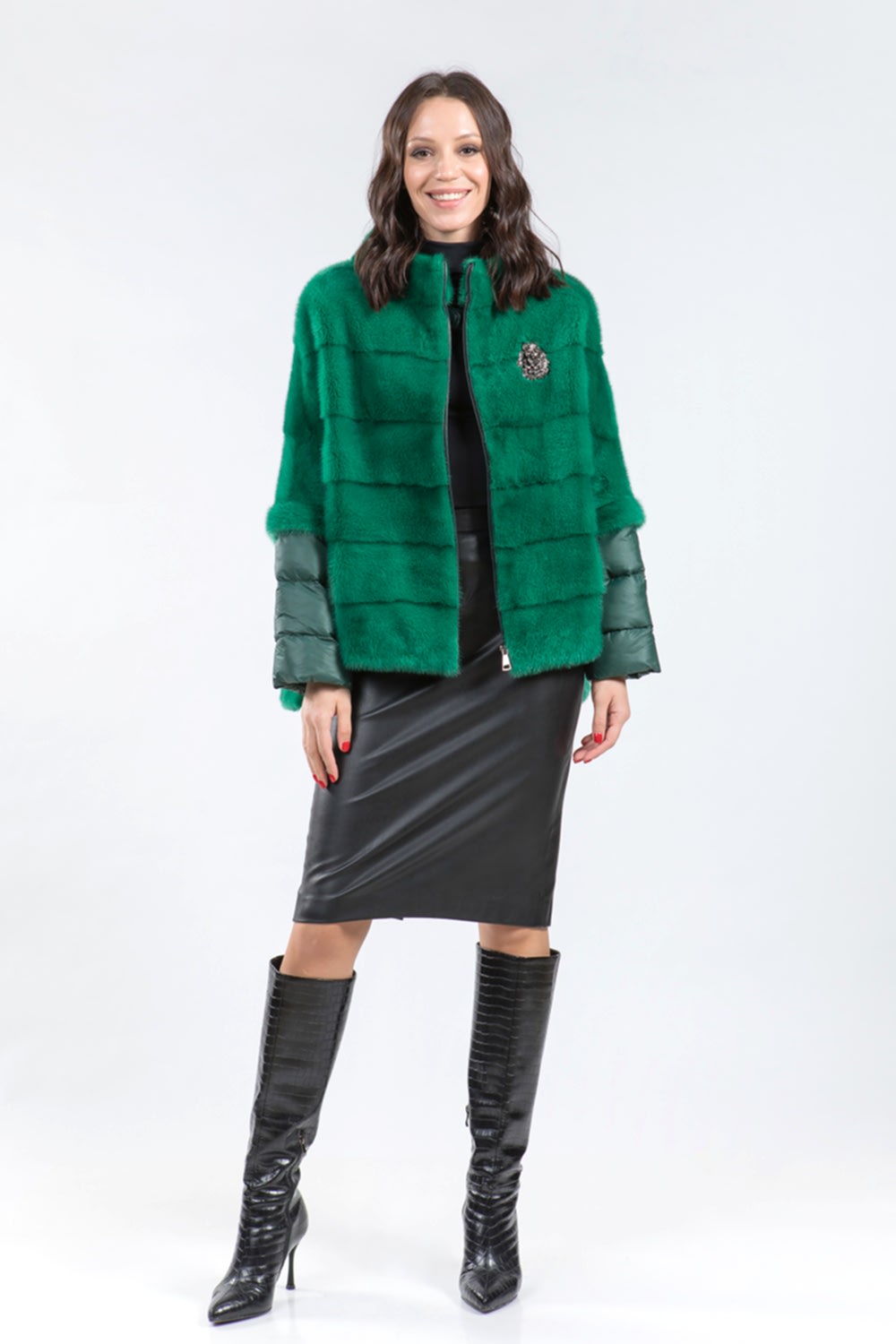 Курточка-жилет из меха норки. Крой изделия поперечная выкладка пластин. Рукава модели трансформируются в более укороченные. Лаконичный дизайн воротника напоминает стиль Шанель. Низ и Pin-Up изделия имеют регулирующие утяжки. Застегивается курточка на молнию. Такая изящная курточка хорошо сидит на любой фигуре и гармонично сочетается с различными аксессуарами. Универсальный вариант в прохладную погоду!