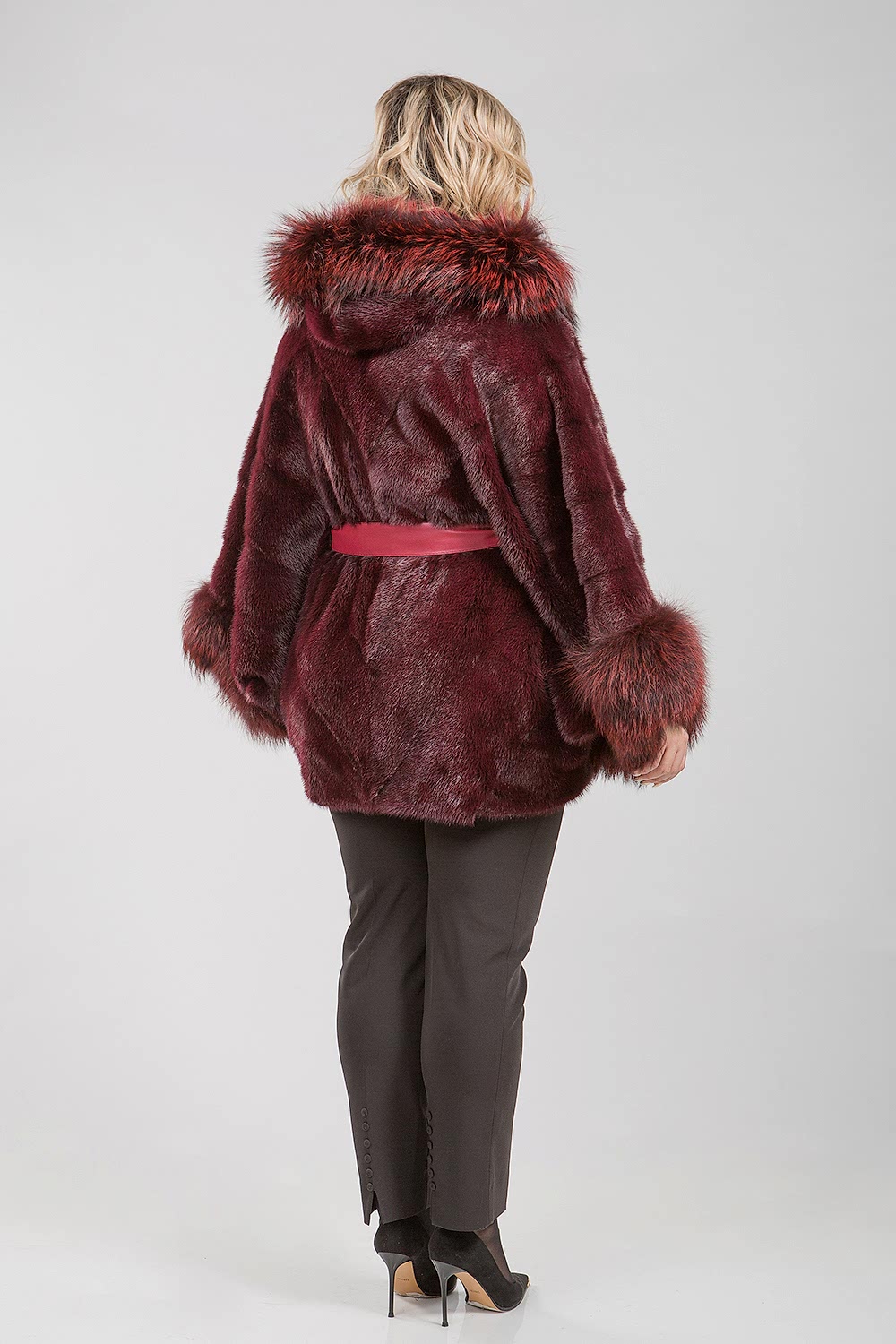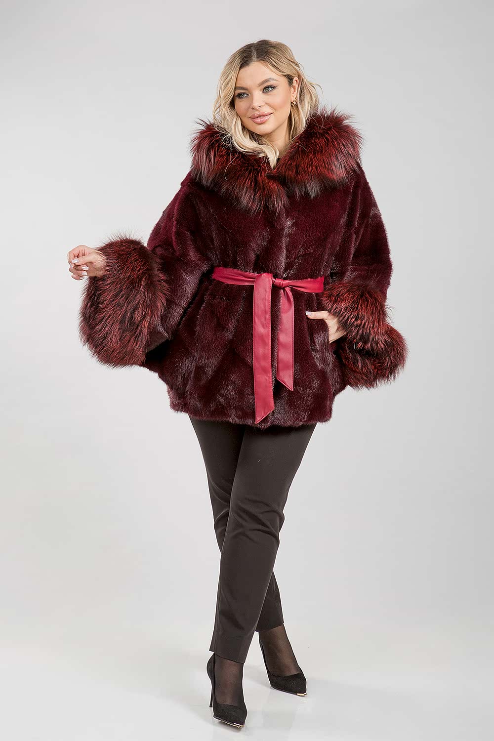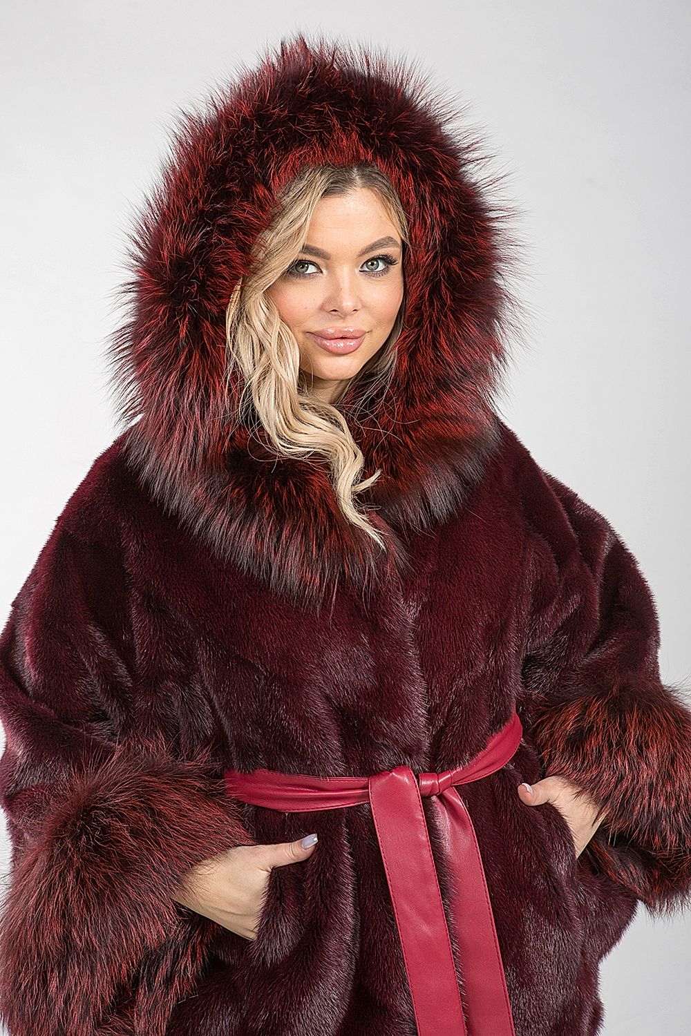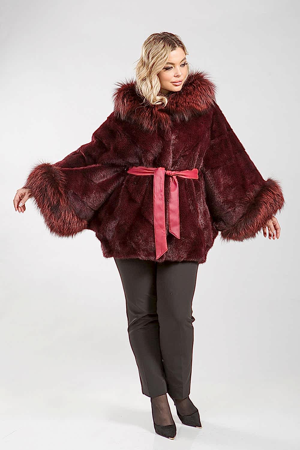 Куртка-пончо, выполненная из норкового меха, с капюшоном, украшенным мехом тонированной лисы. Крой модели представляет собой сочетание пластин с элементами роспуска. Длина изделия составляет 80 см, а рукава имеют свободный крой.