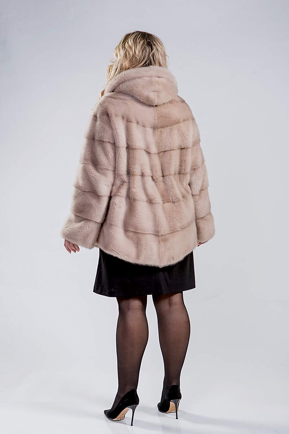 Норковая курточка с Pin-Up Модель выполнена в поперечной выкладке пластин. На талии и рукавах предусмотрены утягивающие элементы для регулировки посадки. Длина куртки составляет 80 см. С помощью потайных молний рукава можно трансформировать в более короткий вариант. Эта куртка прекрасно сочетается как с юбками и платьями любой длины, так и с брюками, от свободных до облегающих. Натуральный мех изделия устойчив к влаге, сохраняет тепло и защищает от ветра.