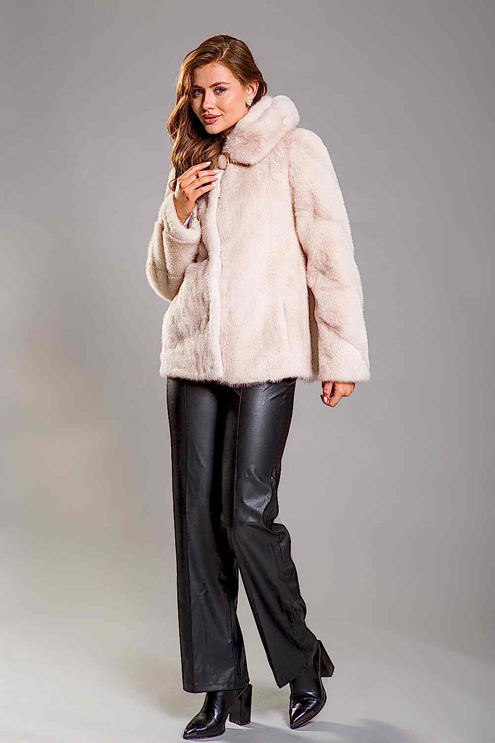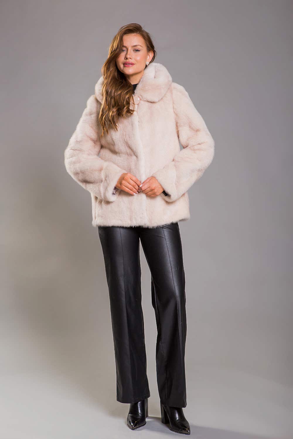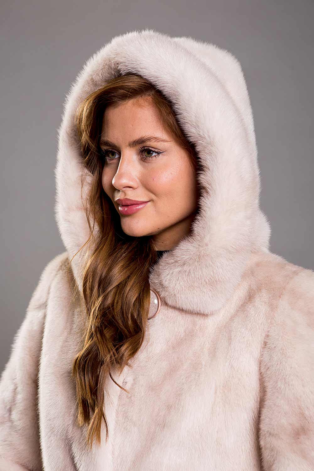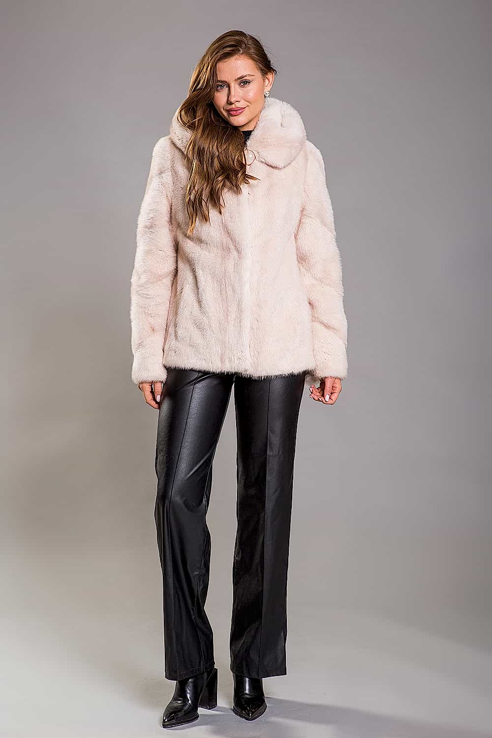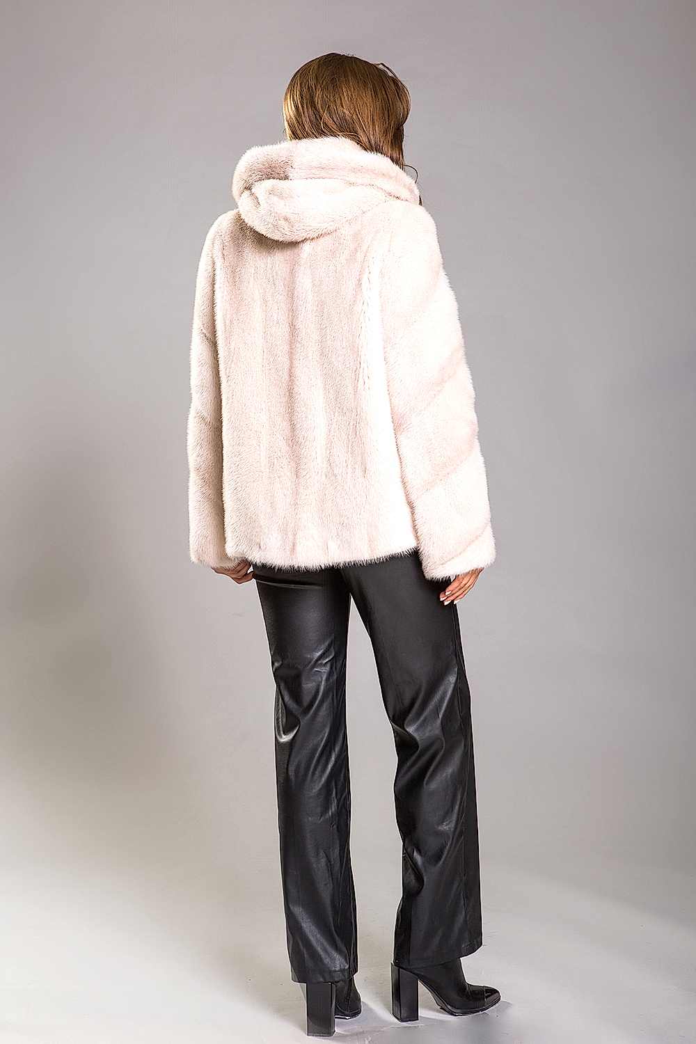 Норковая куртка с капюшоном, выполненная в стиле «роспуск», привлекает внимание своей оригинальной отделкой рукавов, сшитых из пластинок меха, расположенных по диагонали. Для удобства ношения предусмотрены регулирующие утяжки, которые можно Pin-Up по низу изделия и на рукавах.