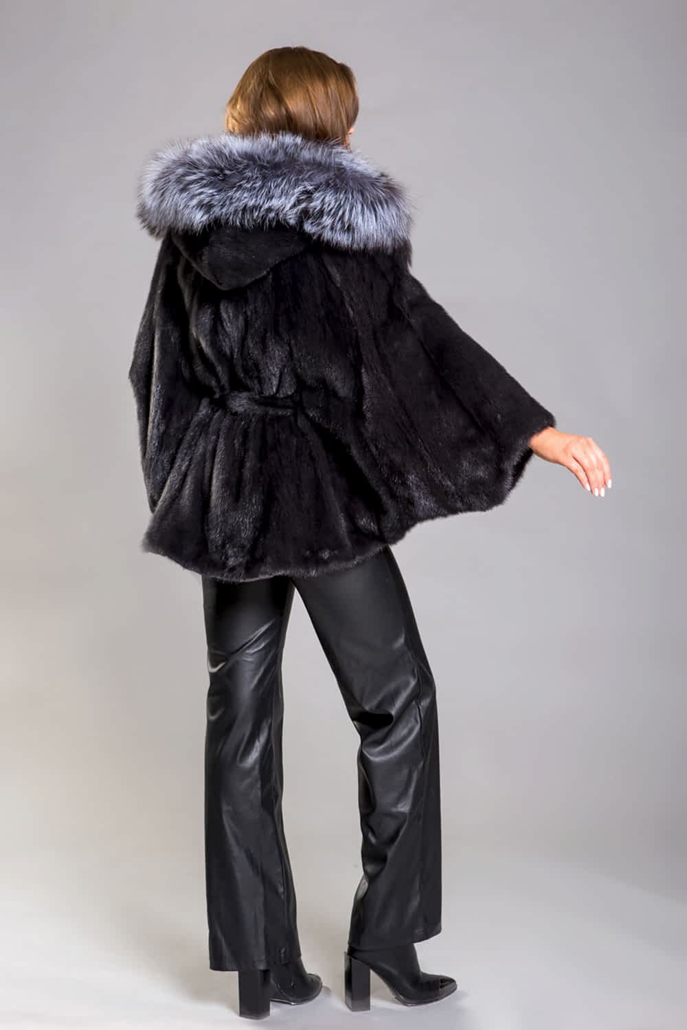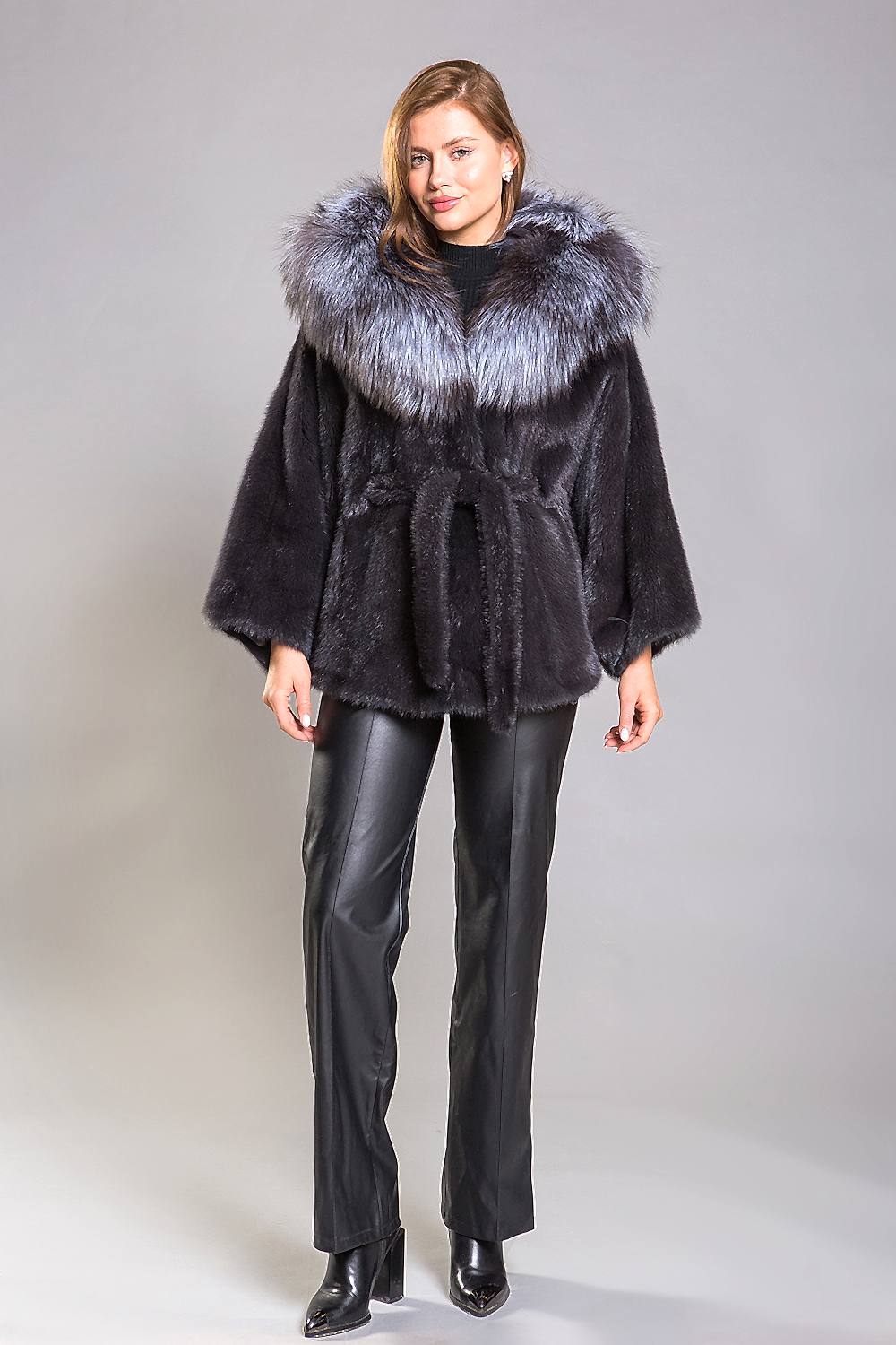 Эта очаровательная курточка, выполненная из меха норки, имеет капюшон, украшенный чернобурой лисой. Её крой представляет собой смесь традиционного роспуска меха с добавлением пластин, что придаёт изделию особую текстуру и рельеф. На рукавах предусмотрены регулирующие утяжки, которые позволяют моделировать и подчёркивать фигуру. Длина изделия составляет 75 сантиметров. Меховой пояс, продеваемый внутрь курточки, придаёт ей оригинальность и изысканность. А благодаря роскошной Pin-Up из чернобурой лисы шубка выглядит просто великолепно, внося в образ нотки шика и гламура..