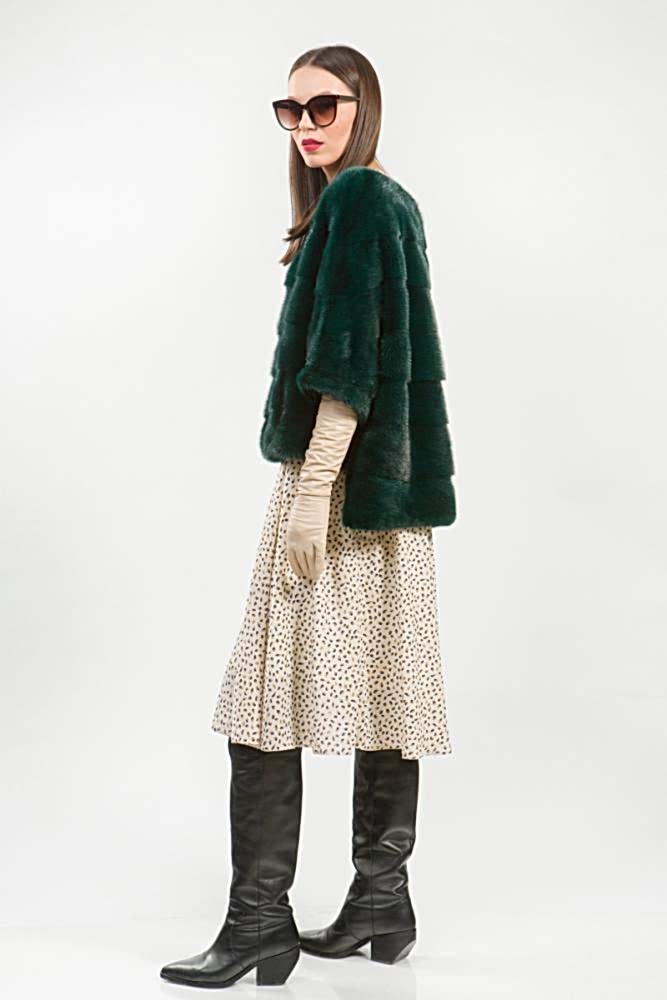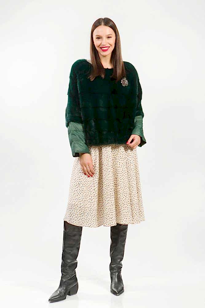 Курточка-жилет из меха норки. Крой Pin-Up пластины с добавлением роспуска. Рукава модели трансформируются в более укороченные. Лаконичный дизайн воротника напоминает стиль Шанель. Низ и рукава изделия имеют регулирующие утяжки. Такая изящная курточка хорошо сидит на любой фигуре и гармонично сочетается с различными аксессуарами. Универсальный вариант в прохладную погоду!